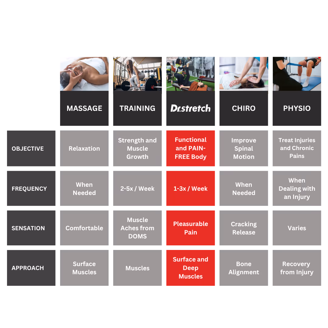 At Dr.stretch, we are committed to delivering excellence and effectiveness in our services. Our focus rests on two scientifically proven stretching techniques that promise long-term results: PNF (Proprioceptive Neuromuscular Facilitation) and passive stretching. We pride ourselves on our expertise in these methodologies, designed to push your boundaries and unleash your full physical potential. Experience the profound difference of tailored, scientifically-backed stretching techniques that are customized to your body's needs and goals.